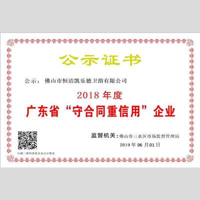 獎(jiǎng) 項(xiàng):"2018年度廣東省“重合同守信用”企業(yè) ——佛山市恒潔凱樂德衛(wèi)浴有限公司"