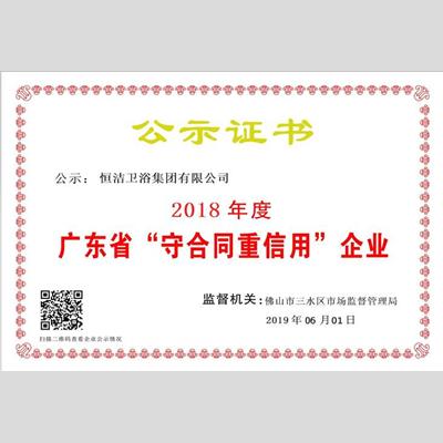 獎(jiǎng) 項(xiàng):"2018年度廣東省“重合同守信用”企業(yè) ——廣東恒潔衛(wèi)浴銷售有限公司"