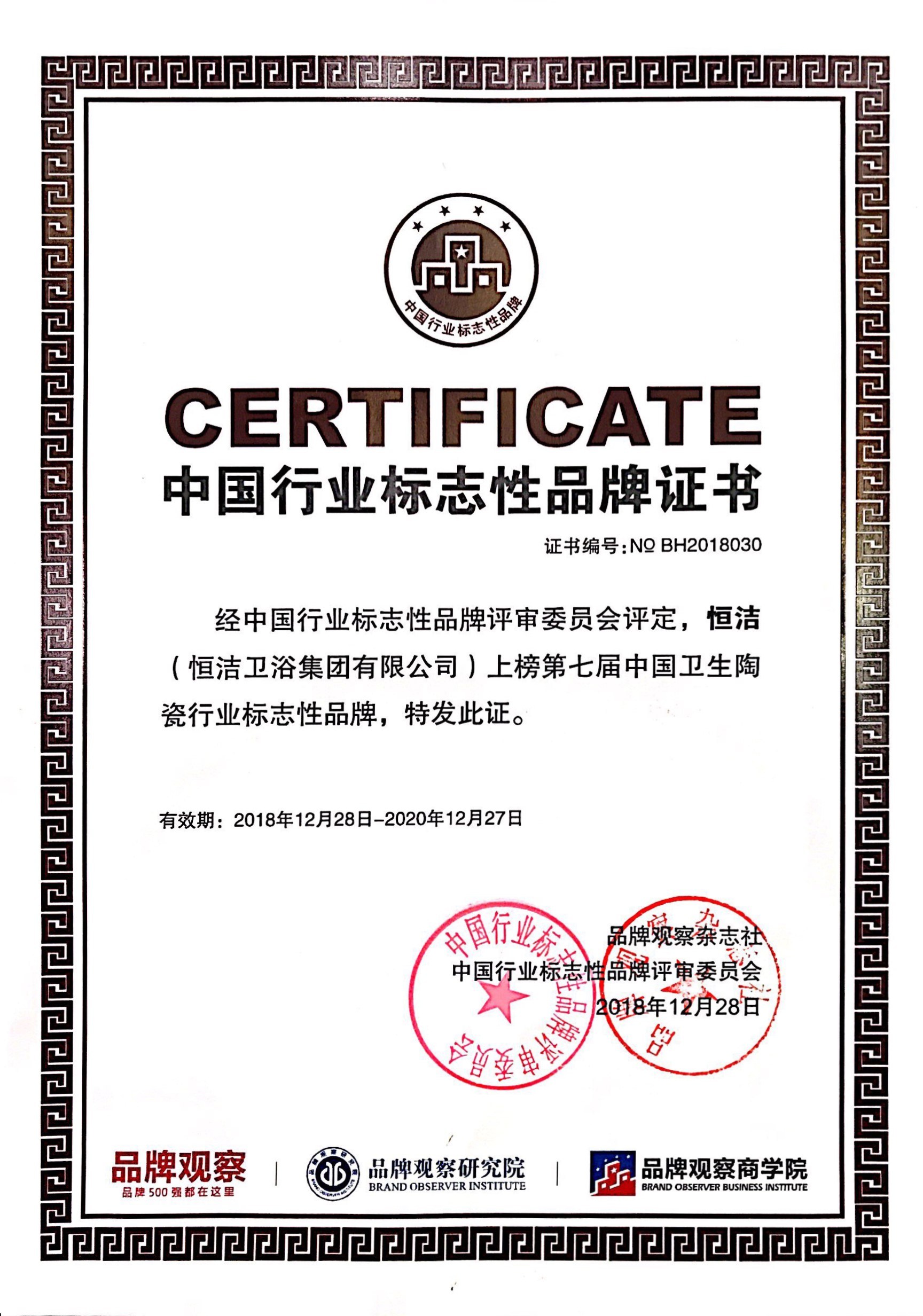 12月28日,由中國商業(yè)經(jīng)濟學(xué)會、全國品牌社團聯(lián)席會、品牌觀察雜志社、品牌觀察研究院、品牌觀察商學(xué)院、北京國信品牌評價科學(xué)研究院聯(lián)合舉辦的第7屆中國行業(yè)標(biāo)志性品牌頒獎儀式在福州舉行,恒潔榮膺行業(yè)唯一的「2018中國衛(wèi)生陶瓷行業(yè)標(biāo)志性品牌」,與同時上榜的華為、格力、方太等各自行業(yè)的標(biāo)志性品牌一道,共顯中國品牌風(fēng)采。